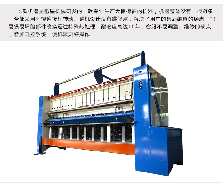 產品簡介:單梁大棚棉被機(全自動旋梭型引被機):新一代(單梁大棚棉被機,單梁大棚保溫被機)全自動引被機,不留被頭,一人操縱,簡單快捷。我公司開發研制的新一代旋梭型仿手工引被機(單梁大棚棉被機,單梁大棚保溫被機),采用超大旋梭,一次可絎縫200條被子,減少換底線的次數,樞紐部門精心設計,兩分鐘可引一床被,線條美觀,針距均勻,大小可調。此棉被機(單梁大棚棉被機,單梁大棚保溫被機) 設計科學合理,安全可靠,整體美觀大方價格低廉,回本快,是被子加工用戶家庭致富的理想產品。